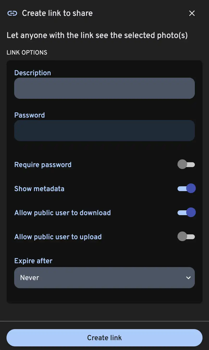 You can customize the public share link by setting an expiration date, password protection, allow what actions can be performed on the shared assets, and more.